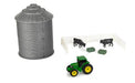 - Includes a mini grain bin, 2 cattle, 2 hay bales, 4 fence pieces and a tractor